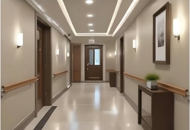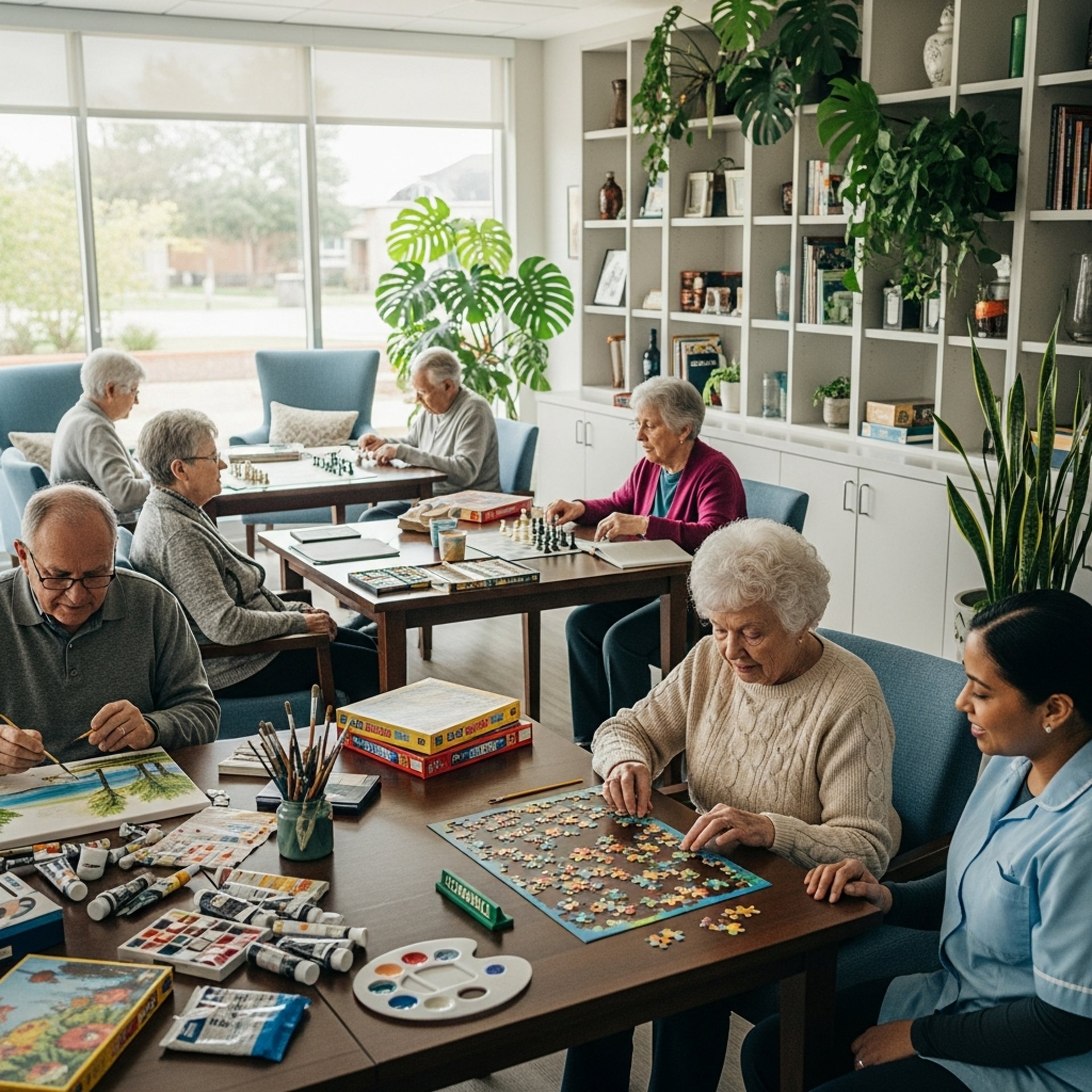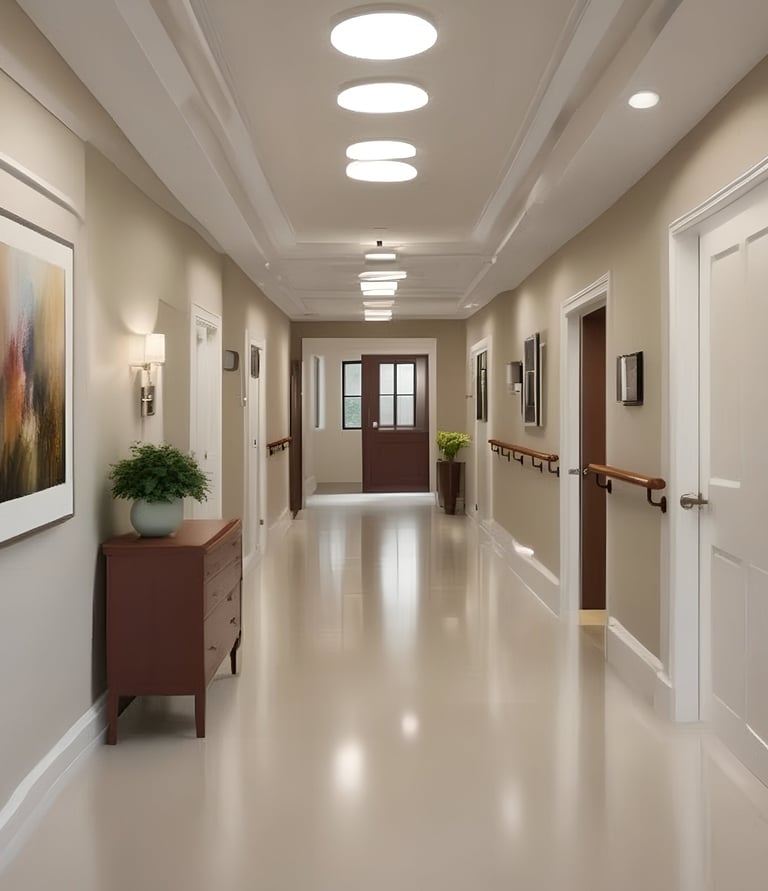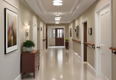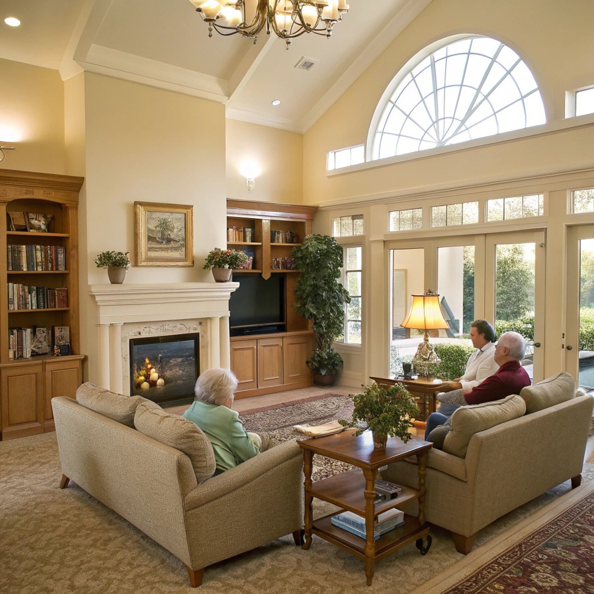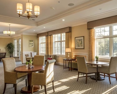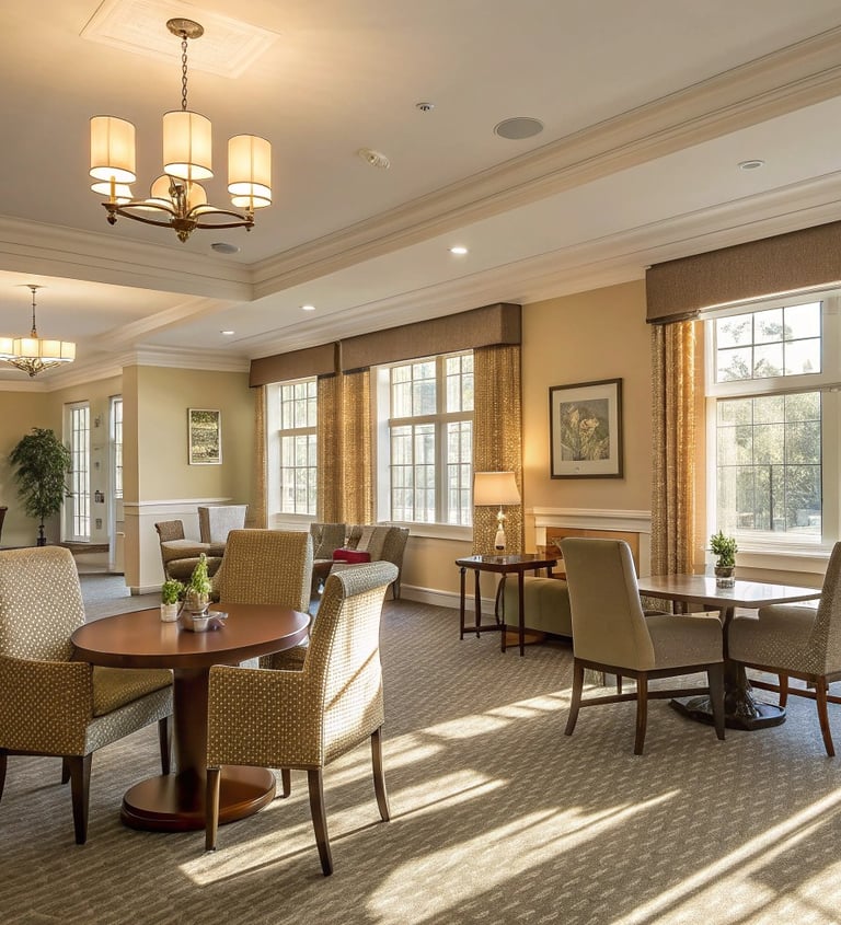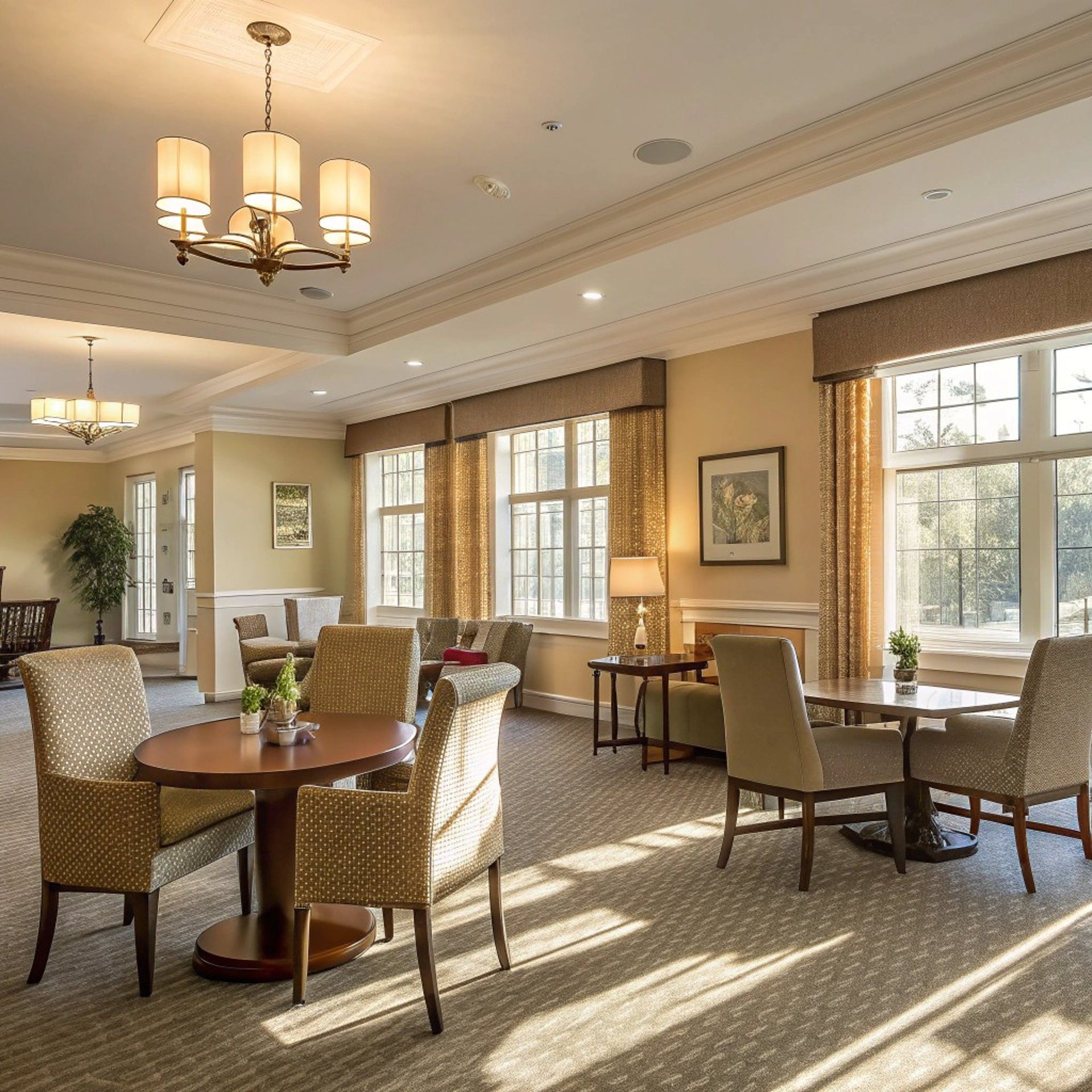 A warm, hospitality-style environment featuring lounges, activity rooms, dining spaces, and calming interiors that feel like home.