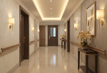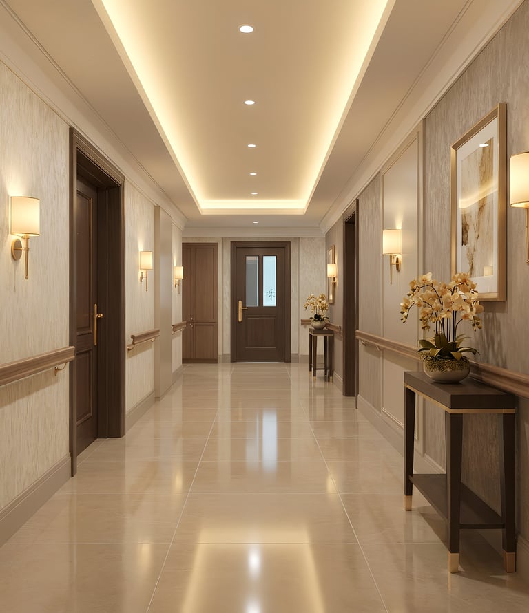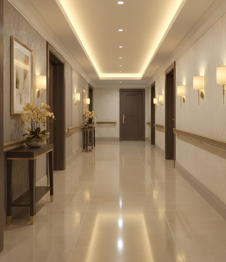 A warm, hospitality-style environment featuring lounges, activity rooms, dining spaces, and calming interiors that feel like home.